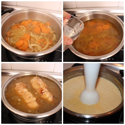 En el mismo aceite se sofríe la cebolla y la zanahoria troceadas, se les añade el vaso de vino blanco, el caldo casero o la pastilla de caldo junto con agua y dejamos que hierva, añadimos las pechugas y las dejamos cocer hasta que estén tiernas, unos 35 minutos aproximadamente.