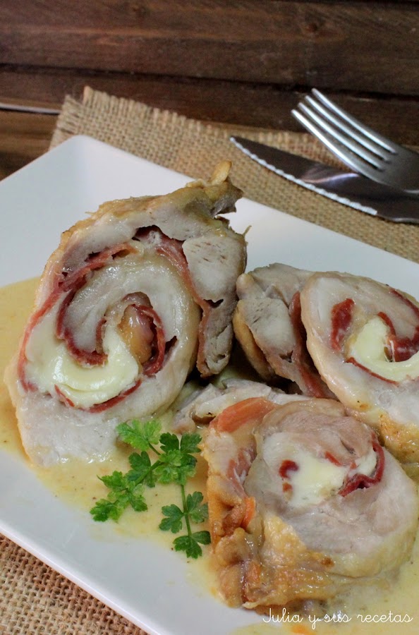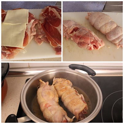 Se abren las pechugas de forma que queden como un filete grande, se les pone sal y pimienta al gusto, se pone encima una loncha de jamón serrano y otra de queso. Se enrollan y se atan. Se sofríen en una cazuela con el aceite de oliva.