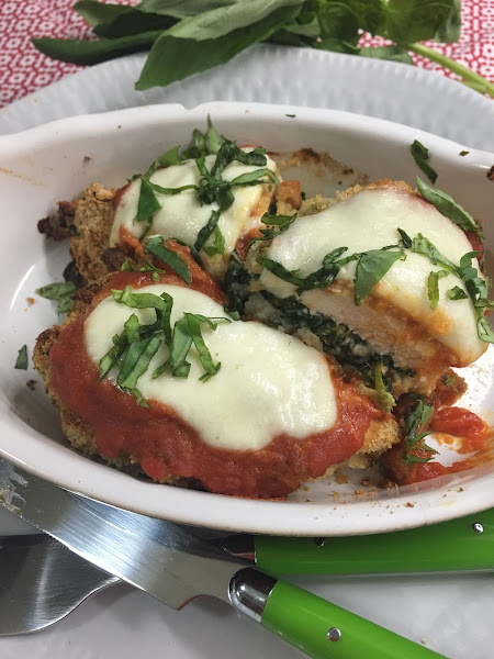 Se sacan del horno, se cubren las pechugas con la salsa de tomate y se coloca encima de cada una una rodaja de queso mozzarella. Se vuelven a introducir en el horno y se mantienen unos 10 minutos más, hasta que el queso se funda.
