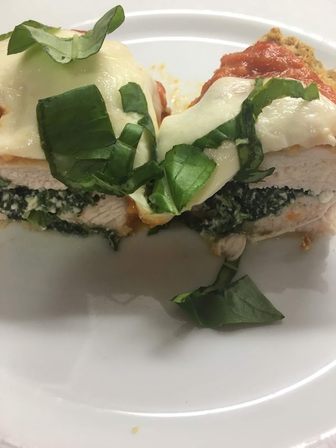 En estas dos últimas fotos podéis ver el corte de la pechuga con el relleno a la vista.