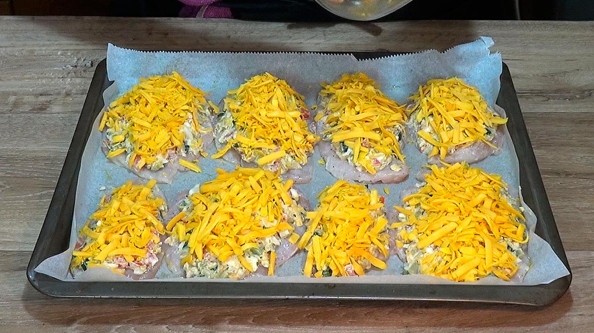 5 colocamos un trozo de papel de horno sobre una bandeja y le ponemos un poco de aceite, lo repartimos sobre todo el papel con una brocha de silicona, colocamos la carne sobre el papel ordenadamente y repartimos el relleno sobre cada filete de pollo, por encima del relleno repartimos el queso que nos queda (Foto 5).Foto 5