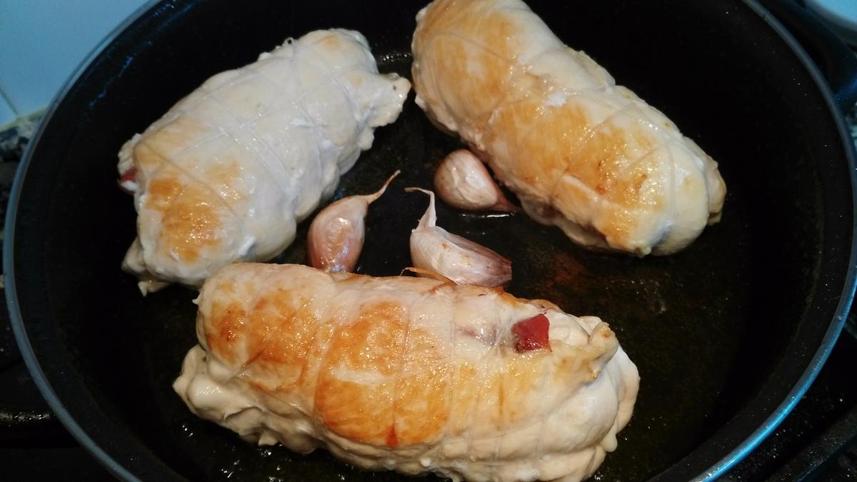 Enrolla y ata las pechugas. En un poco de aceite frielas ligeramente con unos dientes de ajos.