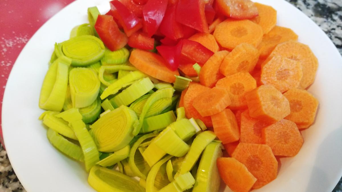 Retiramos el pollo y en el mismo aceite incorporamos las verduras, dejamos que pochen unos 10 minutos a fuego suave y añadimos tres cucharadas de tomate frito.