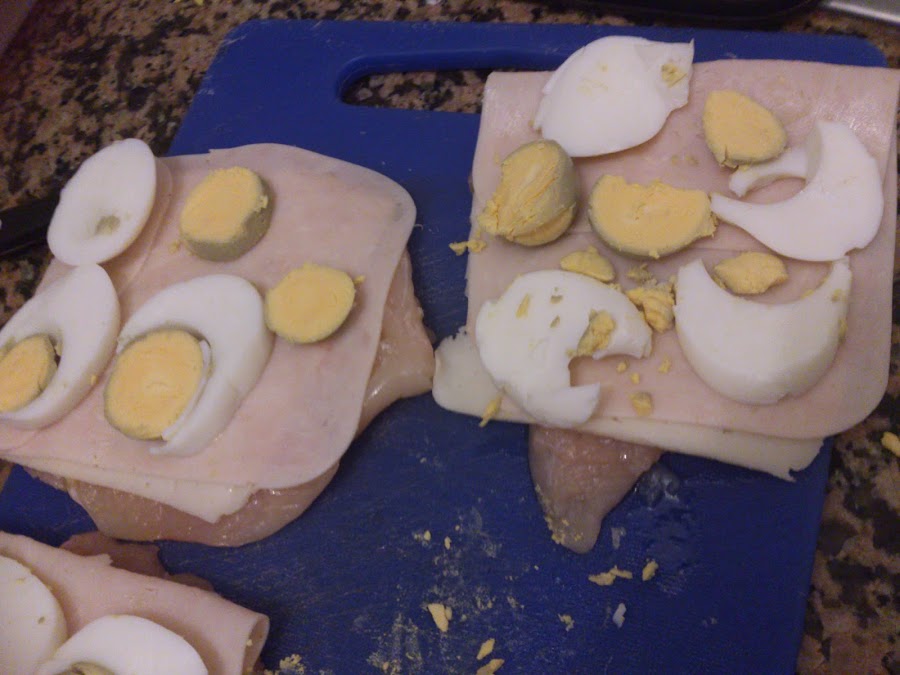 la vamos rellenando, queso,jamón,huevo y finalmente queso de nuevo( no llegueis hasta el final como lo hice yo, por que luego será más dificil enrollar)