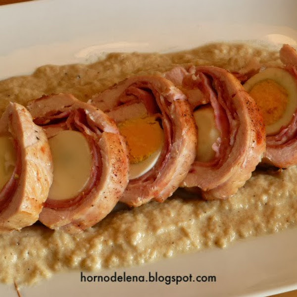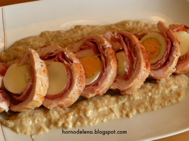 Abrimos la pechuga y ponemos el bacon, el queso, el jamón york y los dos huevos cocidos.