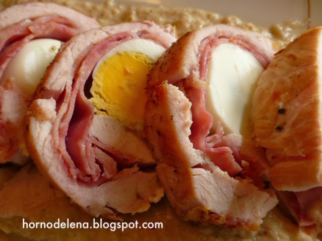 Sacada la pechuga del horno cortamos el cordel que la ata y cortamos la pieza en rodajas gruesas. Con la cebolla y el vino blanco del fondo hacemos la salsa añadiendo mas vino si es necesario. La salsa se puede hacer lo espesa que queramos.