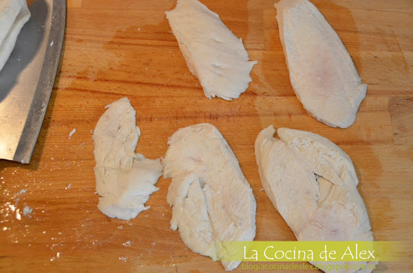 Una vez pasado el tiempo, sacamos las pechugas a una tabla y antes de que se enfríen totalmente las fileteamos. Este paso lo tenemos que hacer lo mas caliente posible porque si las pechugas esta frías se romperán al cortarlas. Sal pimentamos y reservamos.