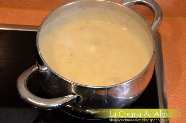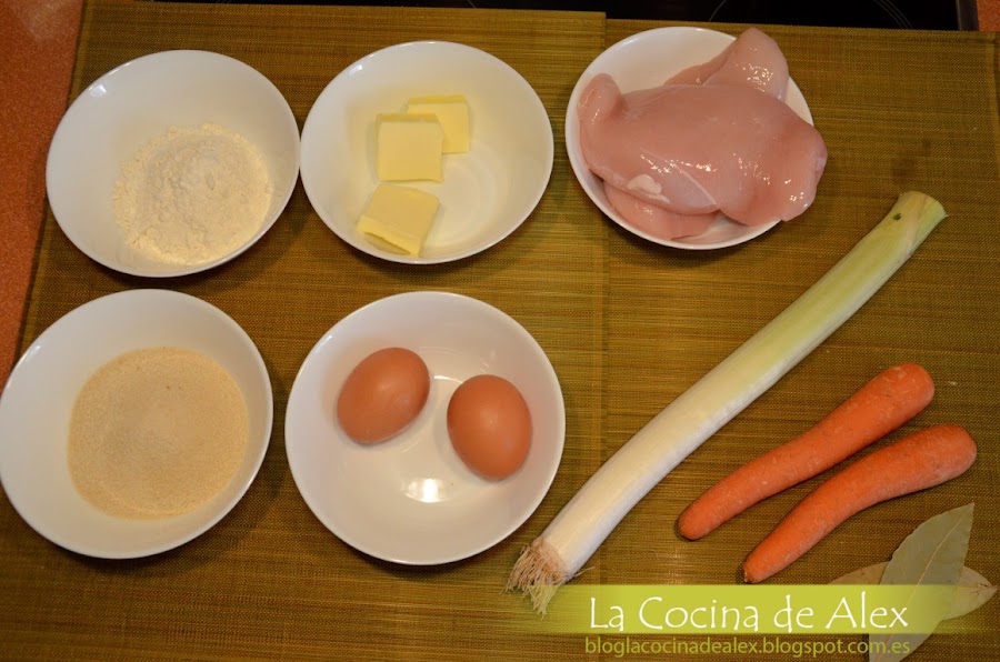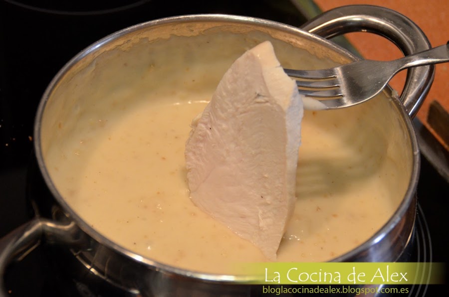 Ahora vamos a preparar una bechamel según los pasos que seguimos en esta receta del blog, lo único que tenemos que cambiar la leche por el caldo corto de verduras donde hemos cocido las pechugas, previamente colado. Para suavizar la bechamel y deforma totalmente optativa podéis ponerle un poco de nata (crema de leche) liquida. Tenemos que conseguir una bechamel no muy liquida para que podamos realizar sin problemas el paso siguiente.