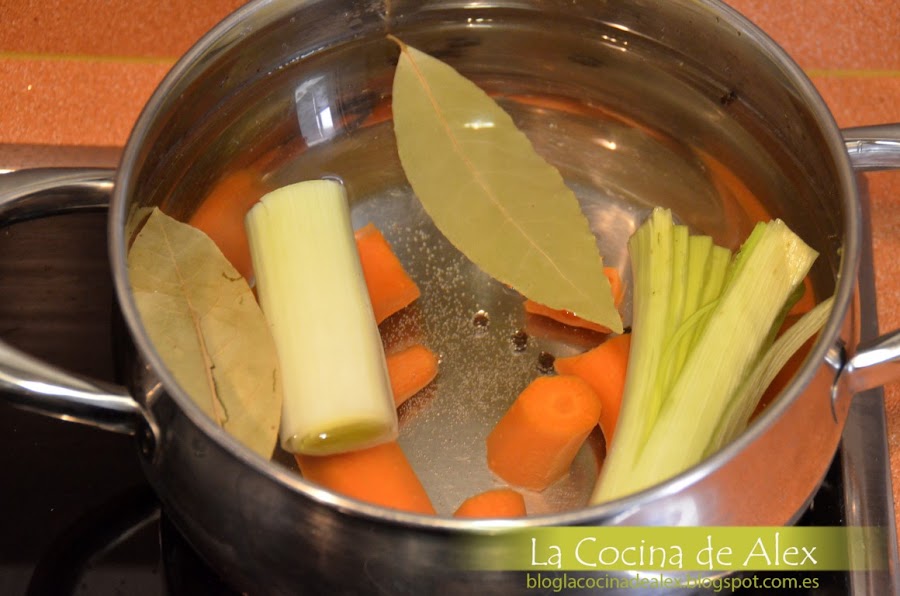 PREPARACIÓN:Lo primero que vamos a preparar es un caldo corto con 1l de agua, las verduras, el laurel y unos granos de pimienta. Y lo dejamos hervir durante 10-15 minutos hasta conseguir que el caldo tenga todo el sabor de las verduras.