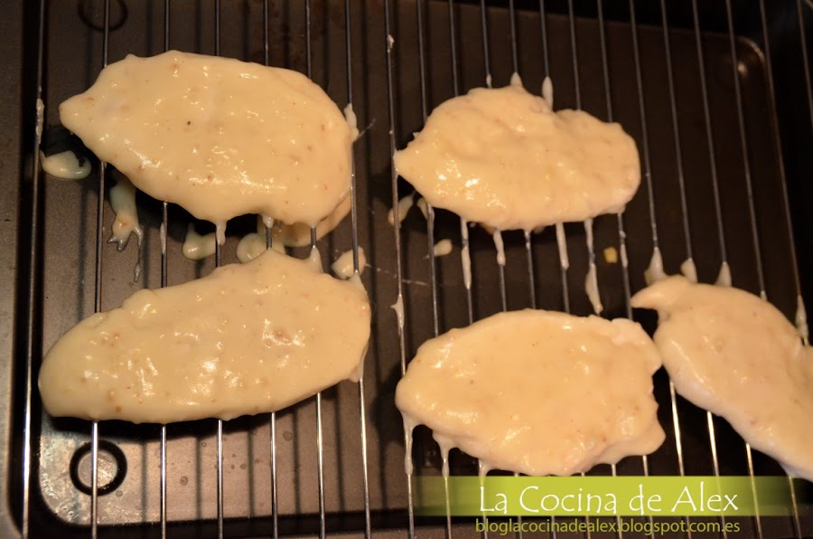 El siguiente paso, con la bechamel todavía en caliente, es pasar los filetes de pechuga por la bechamel para se cubran con una capa fina, dejándolos escurrir sobre una rejilla hasta que se enfríen totalmente. Sabréis que están listos cuando los toquéis con el dedo un poco y no se pegue la bechamel al dedo.