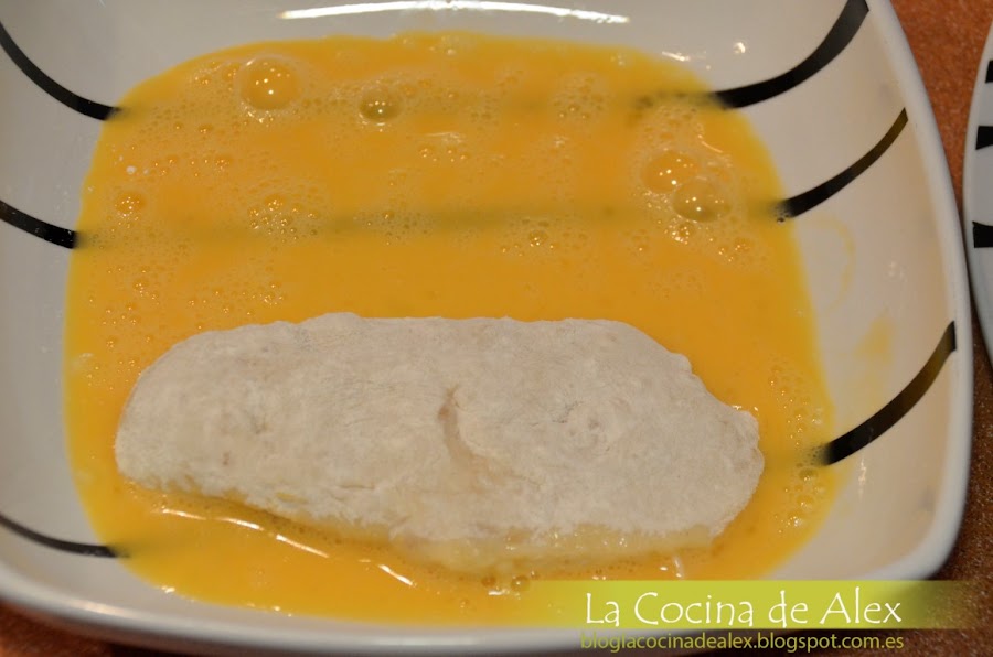 A continuación, cogemos los filetes con cuidado y los empanamos, pasándolos por harina, huevo batido y pan rallado.