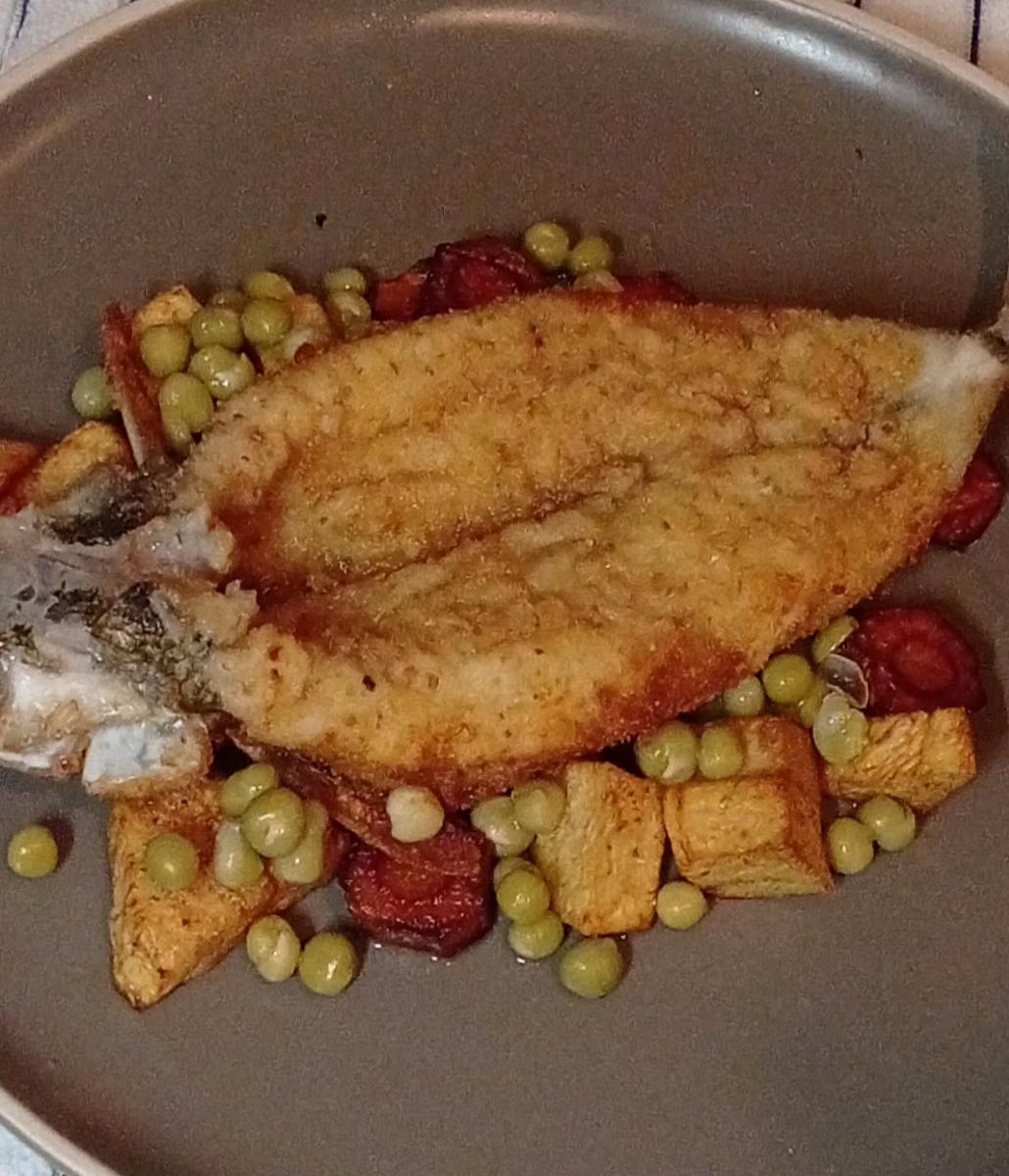 Servimos el pescado decorado con la manteca compuesta y papas en cubos fritas. y algunas arvejas , tambien podemos acompañar con Zanahorias glaseadas con corte Vichy y Cómo hacer Papas Fondant