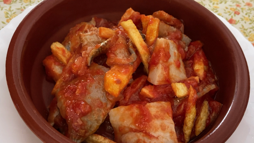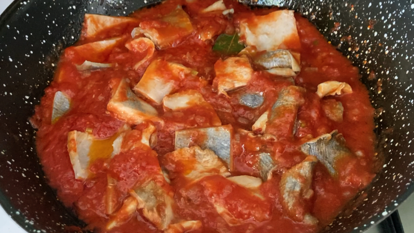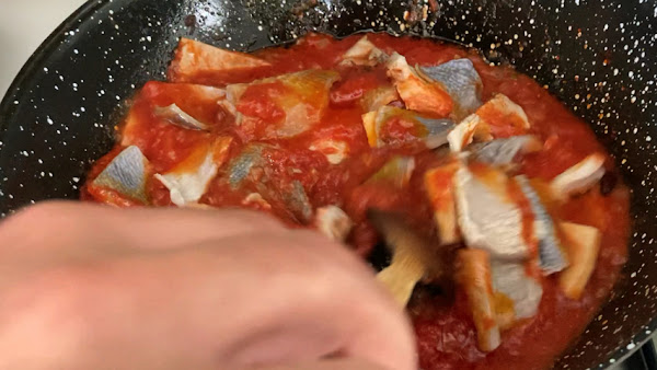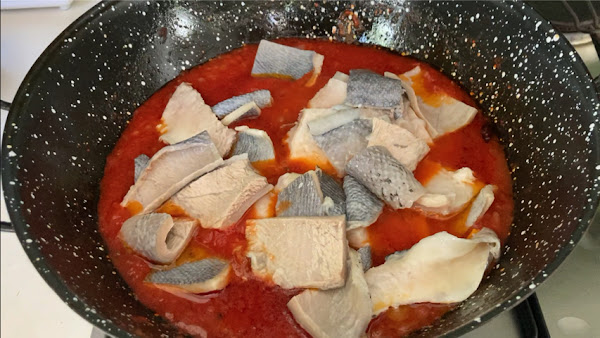 Introduce estos trozos de piel de atún len la salsa de tomate, mezcla y deja a fuego lento unos 5 minutos.