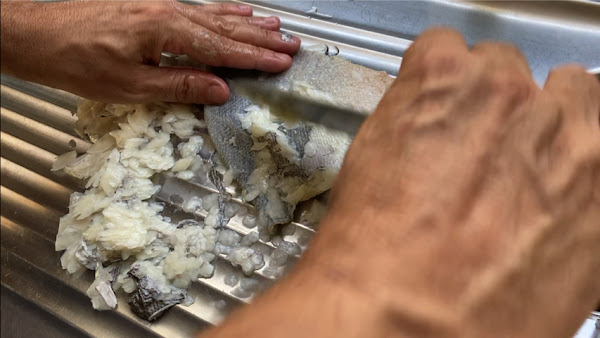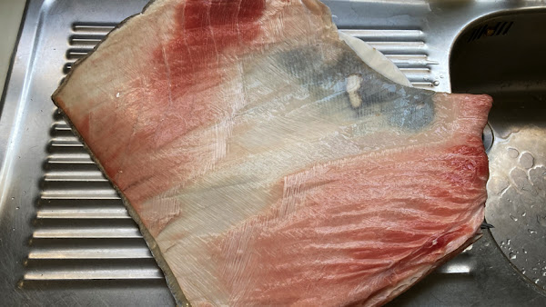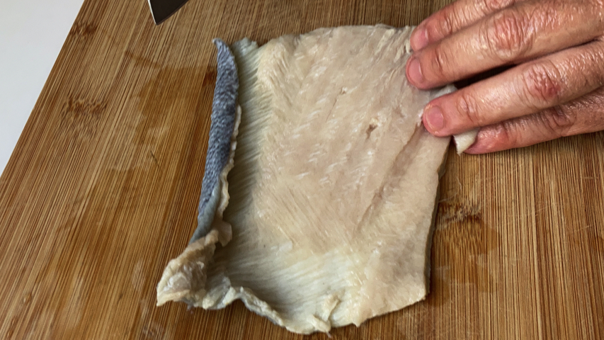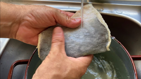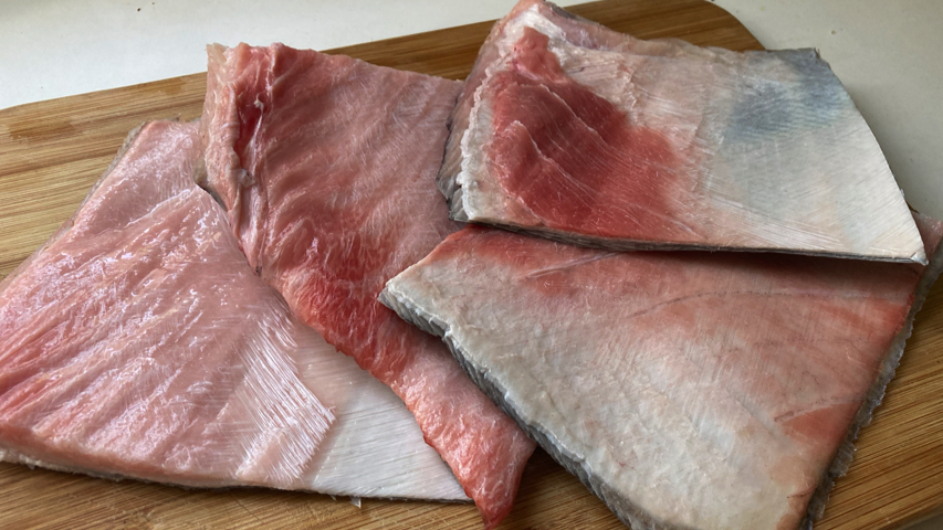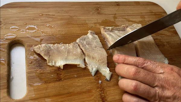 Saca los trozos de piel de atún del agua ya atemperada, retira las escamas, enjuaga bajo el grifo y corta en trozos de bocado.