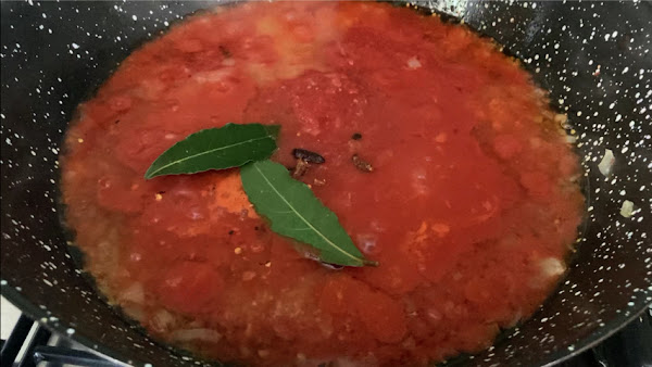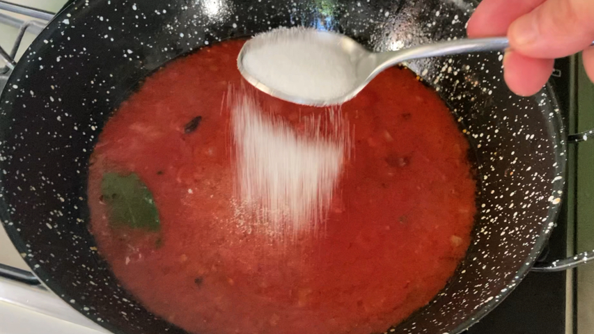 Mientras prepara la salsa de tomate: pela y pica la cebolla menuda, prepara una sartén con aceite de oliva abundante y sofríe la cebolla con un poco de sal. Cuando esté dorada incorpora el tomate, la pimienta molida, la guindilla cayena y el laurel. Añade la sal y el azúcar y deja freír una media hora a fuego lento.