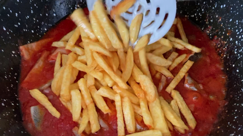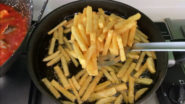 Pela, corta en bastones y fríe las patatas hasta que estén doradas.
