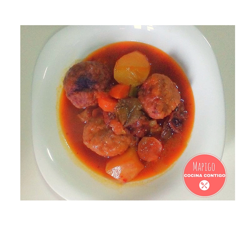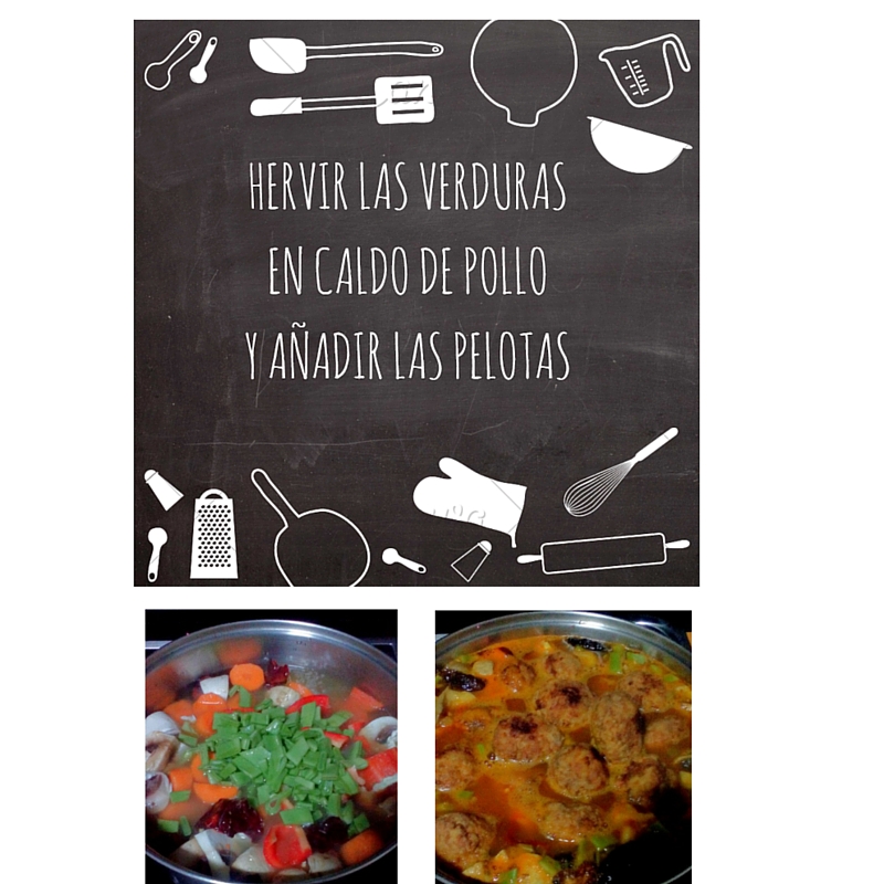 Bien, ya tenemos las pelotas fritas, las apartamos y reservamos. Ahora vamos con el resto de ingredientes, troceamos todas las verduras, zanahorias, judías verdes, cebolla y los tomates secos, podéis añadir o cambiar por verduras que acostumbréis a usar en los guisos, puerro, nabo... lo que tengáis en casa. Añadimos caldo de pollo y cocemos. cuando estén las verduras más o menos cocidas, añadimos las patatas, finalmente añadimos las pelotas y dejamos a fuego lento, "chuf-chuf" una media hora, hasta que pinchemos la patata con un tenedor y este blanda.