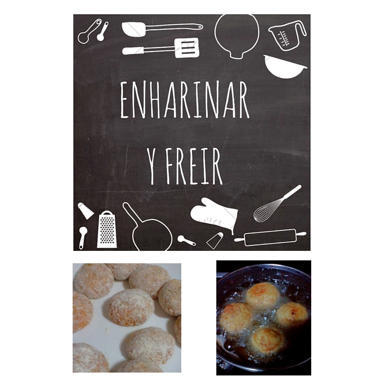 Una vez que tenemos todos los ingredientes de la mezcla para las pelotas bien integrados, vamos a ir formando bolitas con dos cucharas soperas, y luego las amasamos con las manos, dándole forma de pelota. Luego vamos a enharinar cada bola y a freírlas en una sartén con aceite abundante previamente caliente.