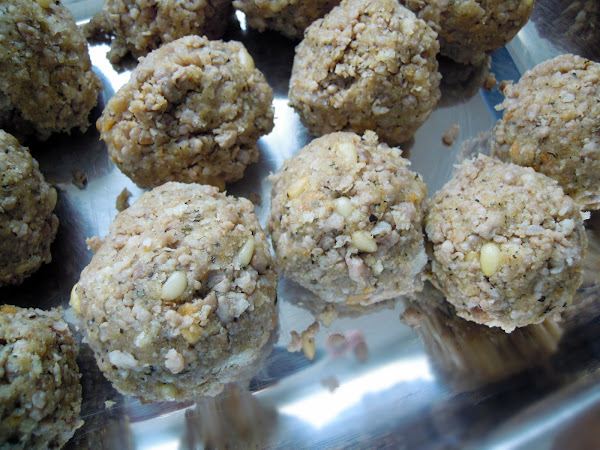 Las pelotas de Navidad están hechas con carne picada de cerdo, piñones, manteca de cerdo, miga de pan, y varias especias de las cuales destaca la hierbabuena que le da un sabor increíble a la paella y a la sopa. También es bastante tradicional ponerle sangre cruda de pollo, pero como a mi no me ha gustado nunca y me comía las que hacían sin ella, ahora yo no les pongo.
