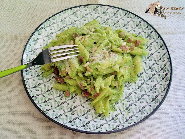 En el vaso de la batidora, poner el calabacín, los piñones, las almendras, 1 diente de ajo, el queso, las hojas de albahaca y menta y sal