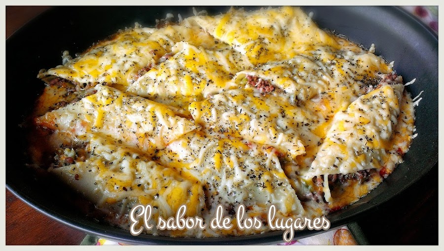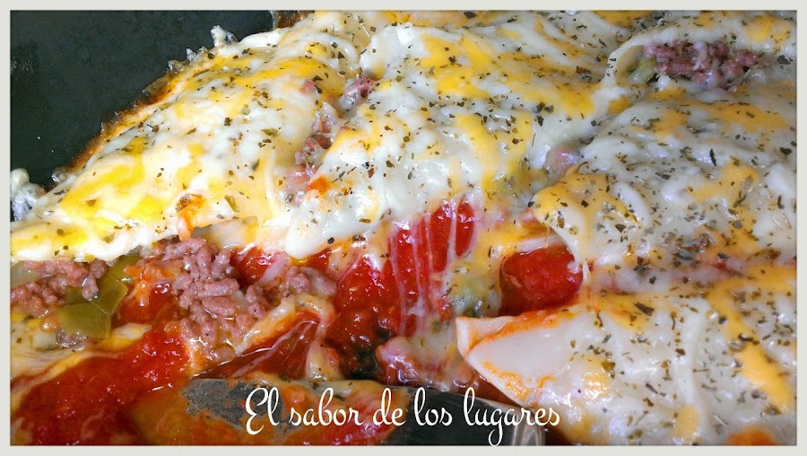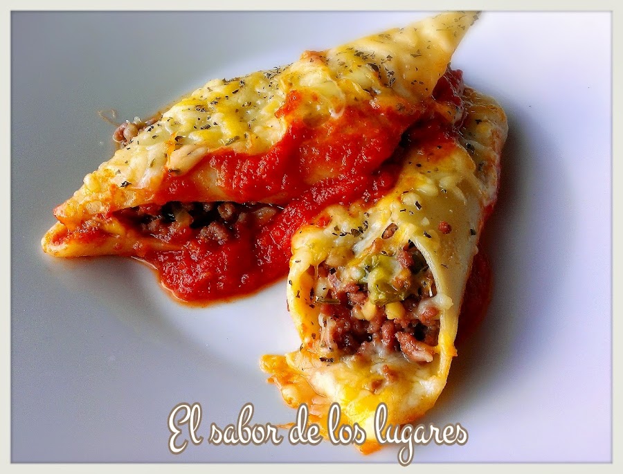 Coloca la salsa de tomate en una fuente refractaria, rellena la pasta con la carne y ponla sobre el tomate. Espolvorea con queso rallado al gusto y una pizca de orégano e introduce en el horno precalentado a 180º (con calor arriba y abajo) hasta que se gratine el queso.