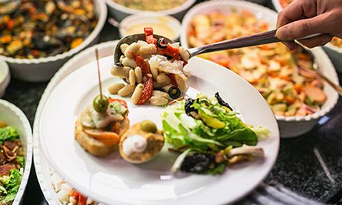 – Pon unas bandejas con diferentes ingredientes que puedan servir de base para “montarse” ensaladas: arroz cocido, alubias blancas, judias verdes, patatas, variedad de lechugas: romana, hoja de roble, rúcula, canónigos, etc. Tomates cherry, gambitas peladas, aceitunas de diversos tipos, pepinillos en vinagre…