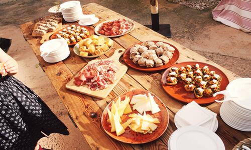 – En varias pequeñas fuentes o en una bandeja grande, pon unos huevos rellenos, buñuelos y croquetas diferentes: de bacalao, de jamón, de atún, de foiegras, de gambas, etc.