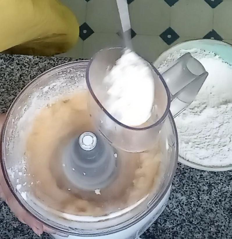 Agregar de a poco el harina mezclada con el polvo de hornear, y empezar a unir sin amasar hasta que se forme una masa suave que no se pega, como la cantidad de harina depende del tamaño de las yemas, te aconsejo la vayas agregando de a poco pero si ves que necesita le agregas una o dos cucharadas de agua bien fría.