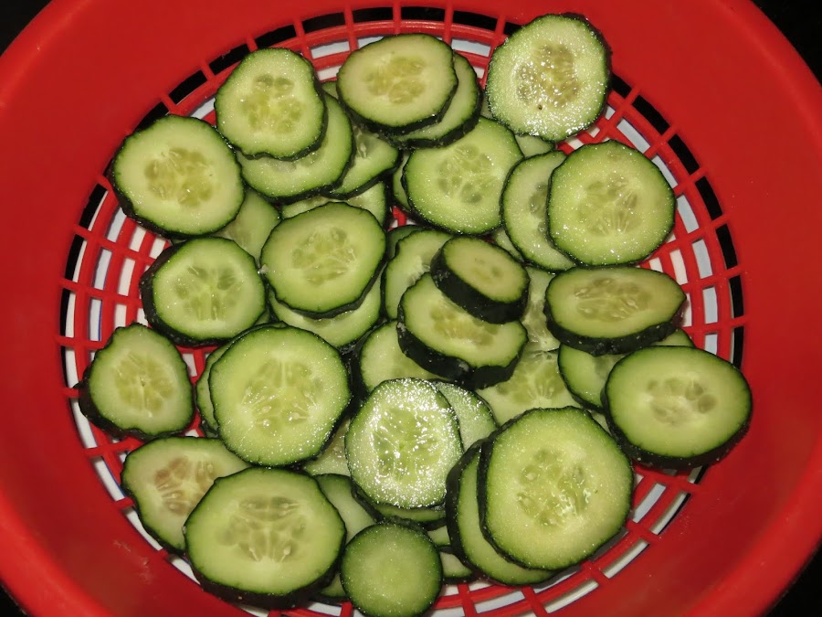 Lavamos bien los pepinos y los cortamos en tiras. Los ponemos en un colador con un puñado de sal hasta que suelte todo el agua.