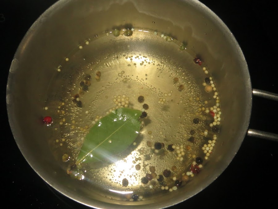 En un cazo ponemos el vinagre, el agua, las semillas de mostaza, la hoja de laurel, la sal y la pimienta. Una vez que hierva la mezcla la retiramos del fuego.