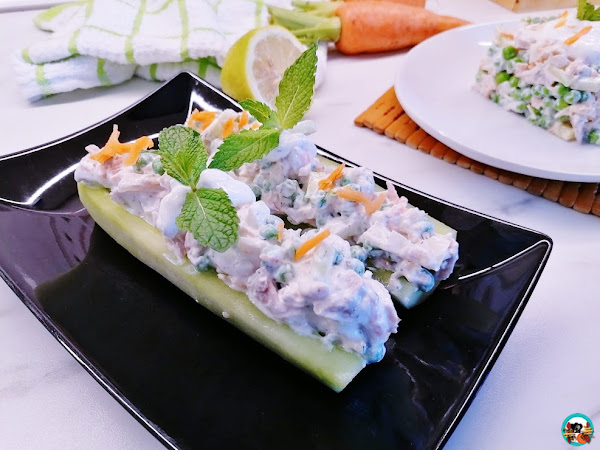 Para hoy tengo un plato fresco, sabroso y ligero; barquitas de pepino relleno de pollo asado, algunas verduras y una fresca salsa de yogur.