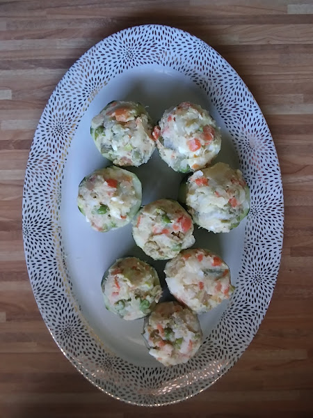 Me sobró un plato de ensaladilla y quería darle salida a un montón de pepinos que compré a un vendedor de los que se ponen en la puerta de su casa con lo que plantan en sus terrenos. Son productos muy ricos que no han sufrido el transporte y no suelen llevar pesticidas, así que aprovecho siempre que puedo.