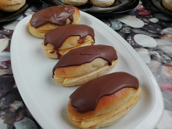 Una vez fríos para los pepitos rellené con crema pastelera y cubrí con chocolate; para las bambas relleno de nata montada (crema de leche) y cubiertos de azúcar glace.