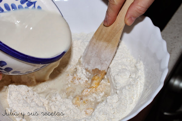 Seguidamente añadimos la leche templada y mezclamos bien.