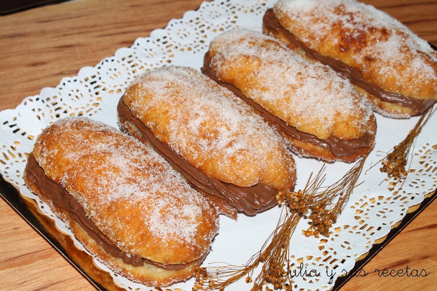 Los dejamos enfriar. Los partimos por la mitad y los rellenamos con crema pastelera normal (ver recetas aqui) o de chocolate (ver receta aqui). Si tenéis una jeringa grande podéis rellenarlos sin partirlos.