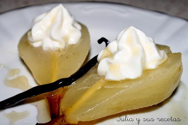 Las dejamos hervir 15 minutos. Las sacamos y dejamos enfriar. Ponemos el liquido de hervirlas al fuego y lo dejamos reducir hasta formar un almíbar flojo. Mientras se hace el almíbar partimos las peras por la mitad y les quitamos las pipas con un sacabolas o un cuchillo, con cuidado de no romper las peras. Las ponemos en un plato y las decoramos con nata montada (crema de leche) (ver receta), o de la que venden en spray. (Si es de spray decorarlas justo en el momento de servir, pues la nata (crema de leche) se baja enseguida), y las regamos con un chorrito del almíbar de vainilla. Os aseguro que están !!deliciosas!!