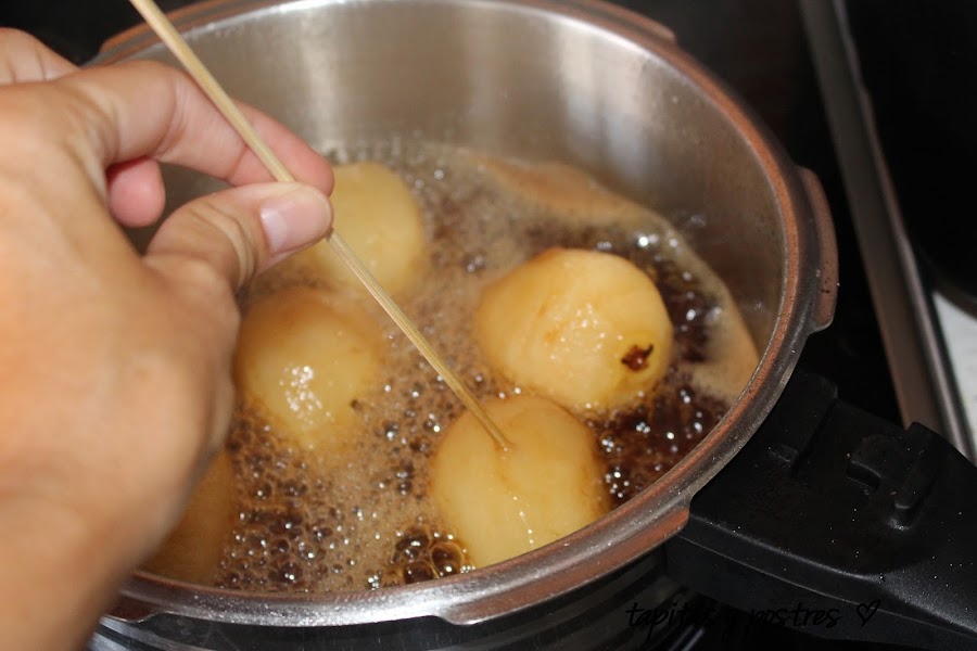 Y cuando al pincharlas con un palillo estén tiernas, las sacamos aparte.Dejamos que el almíbar cueza un poco más para que reduzca,
