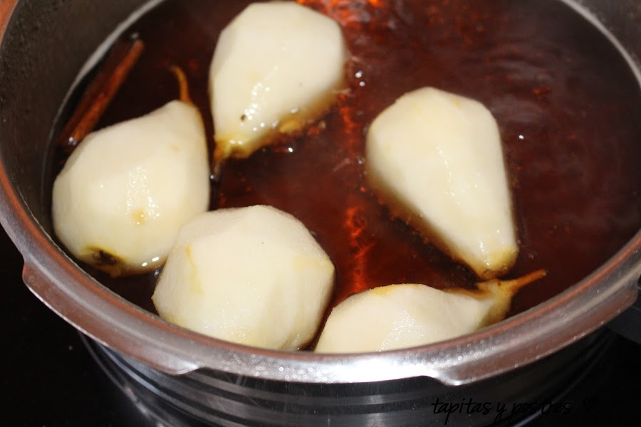 Metemos las peras y dejamos que cuezan hasta que estén tiernas. De vez en cuando le damos una vuelta con cuidado para que se impregnen del almibar.