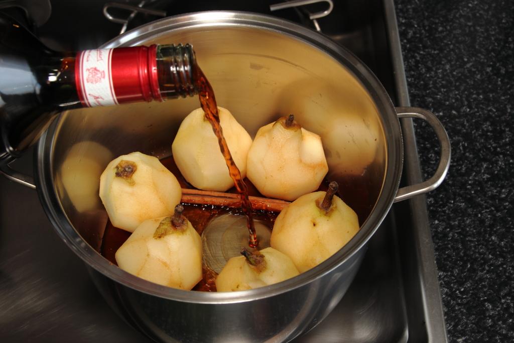 Llevamos a fuego fuerte hasta que hiervan, dejamos la cazuela destapada una media hora para que evapore el alcohol. A continuación tapamos dejando una rendija, moderamos el fuego y dejamos cocer hasta que las peras estén blandas.