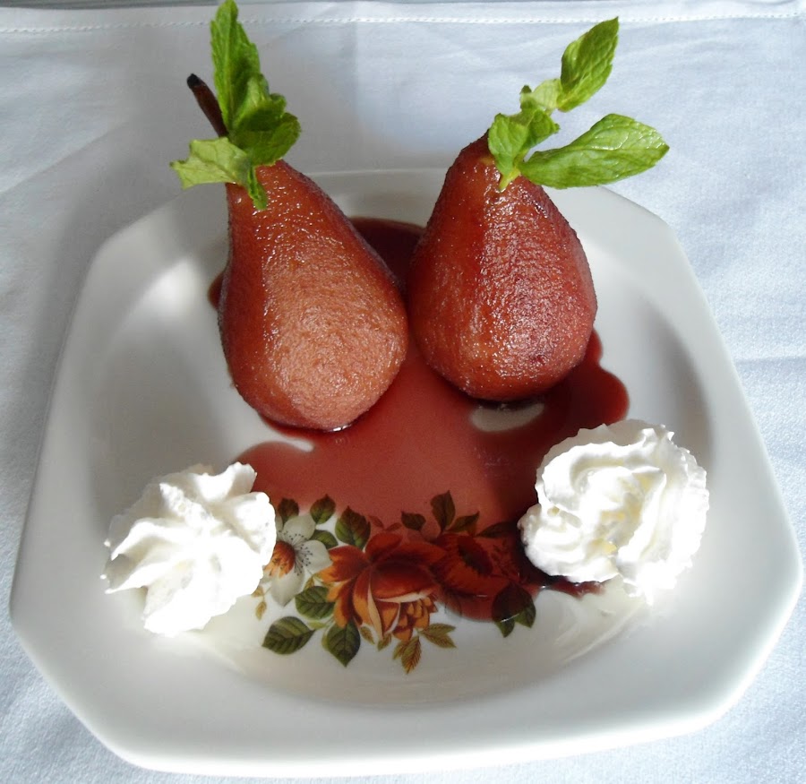 En una cacerola se pone el vino,el azúcar la canela las peras peladas y una ramita de hierbabuena.