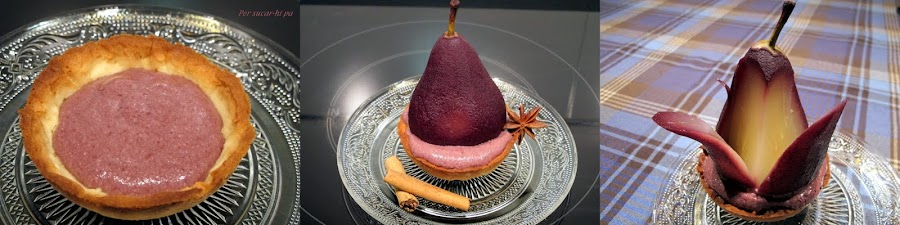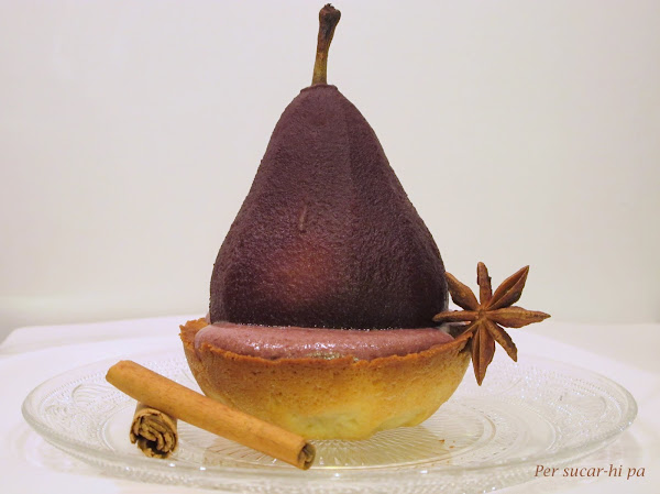 Hemos preparado una crema con el vino de la cocción con la que hemos rellenado unas tartaletas de masa sucrée que sirven de base para las peras. La combinación ha resultado más que buena, está genial!