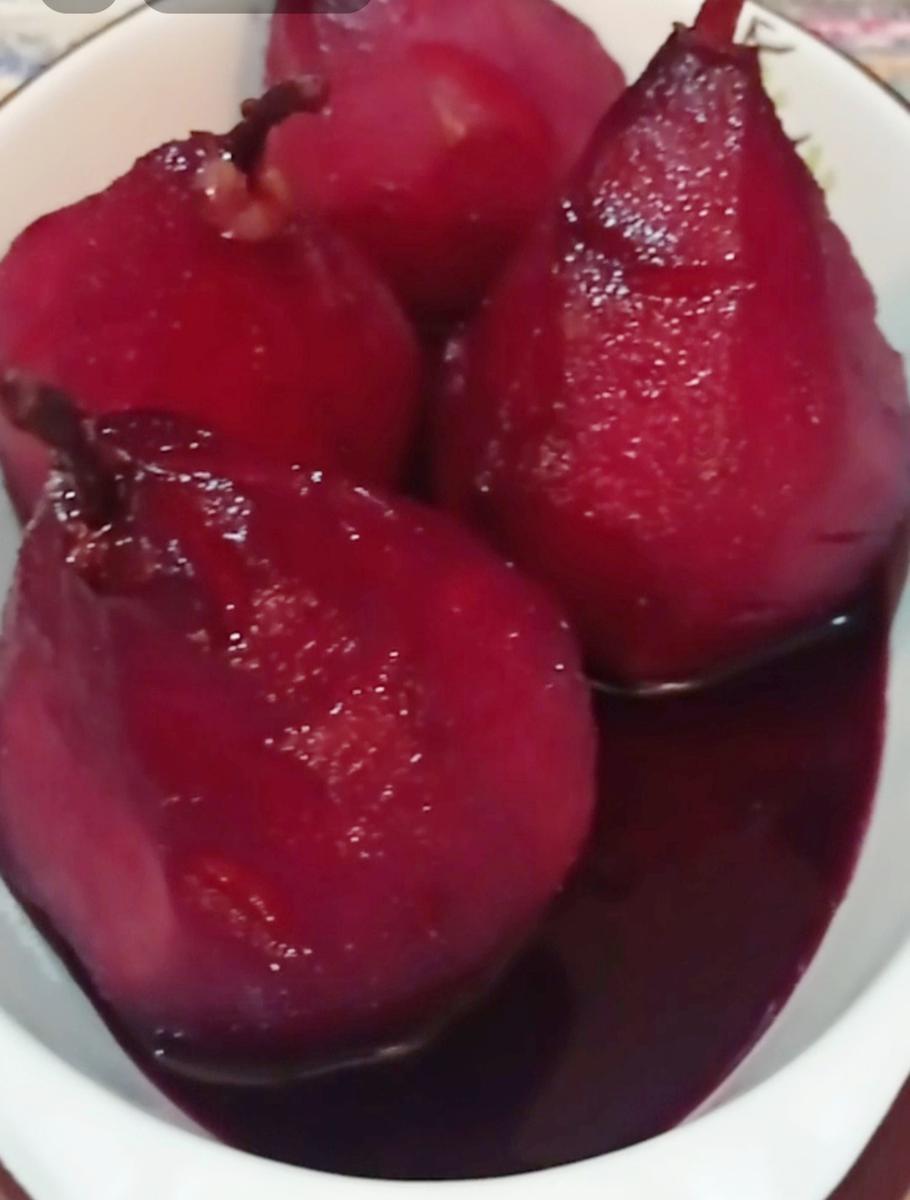 Y asi fue, sobre el mantel blanco que mamá me prestó, lucieron vestidas de rojo mis peras, mostrando su blanco interior , orgullosas de estar en la mesa , dando el toque dulce a una cena que fue inolvidable.