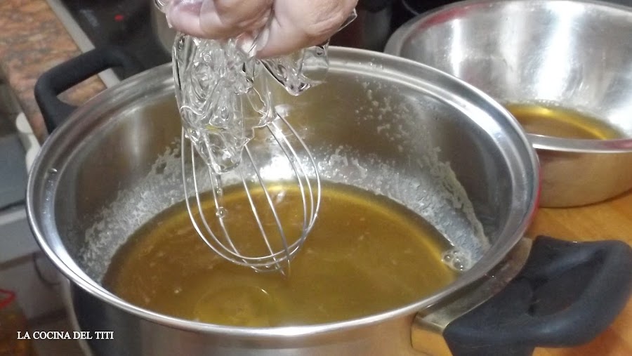 5º Con el almibar haremos una gelatina en el que hidrataremos las hojas de gelatina en agua fria durante diez minutos. Mantendremos en caliente el almibar e incorporamos la gelatina con la ayuda de una varilla. Metemos en el frio