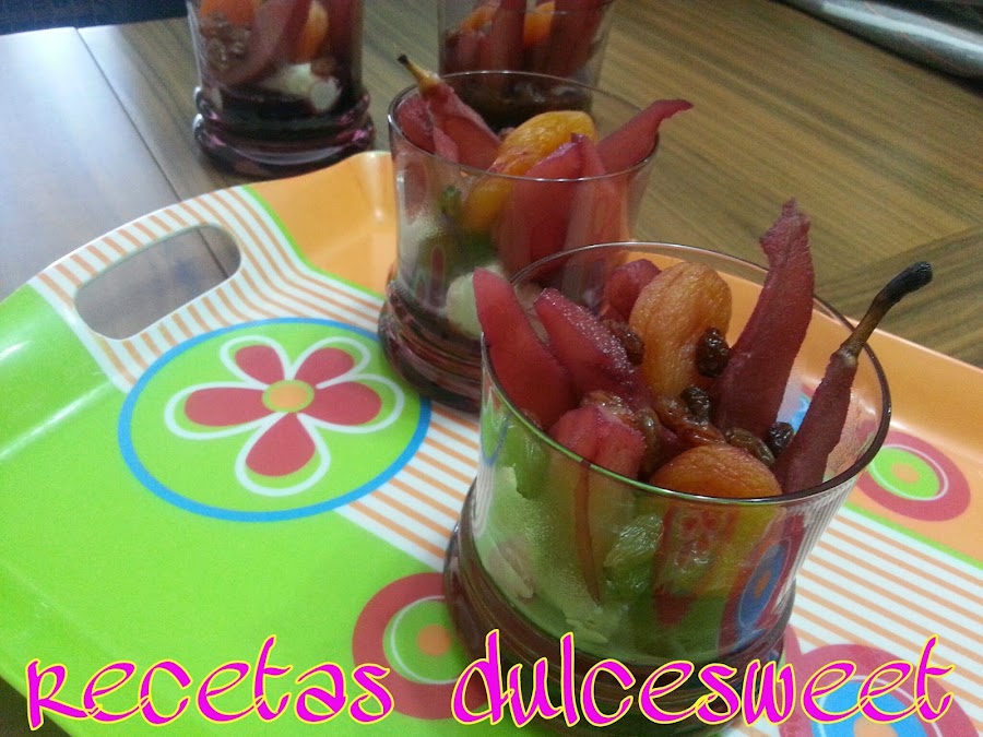Ahora repartiremos el mascarpone en los vasos de cristal, pondremos los trozos de pera unos 4 o 5 por cada vaso, pondremos las pasas y los orejones por encima, y regaremos con el almíbar de vino, lo serviremos caliente.