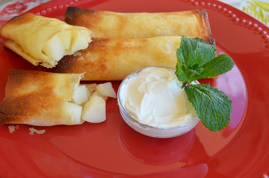 Encendemos el horno a 200º, escurrimos las peras muy bien y cortamos en daditos. En un plato ponemos una oblea de masa brick, doblamos por la mitad haciendo medio circulo, untamos de mantequilla con una brocha, metemos las punta hacia dentro, encima colocamos un poco de peras y cerramos formando un rollito, untamos toda la parte de afuera con mantequilla y colocamos en la bandeja de horno que le hemos puesto un papel de horno, hacer lo mismos con los siguientes hasta terminar, lo metemos en el horno y cuando estén doraditos lo sacamos.