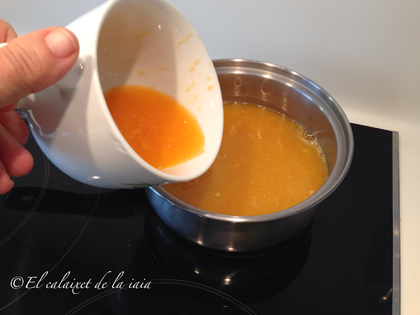 Volcaremos en un cazo los zumos sin preocuparnos de la pulpa ya que luego lo colaremos