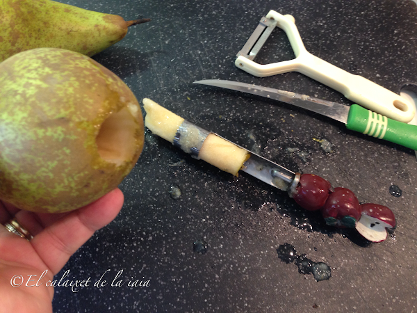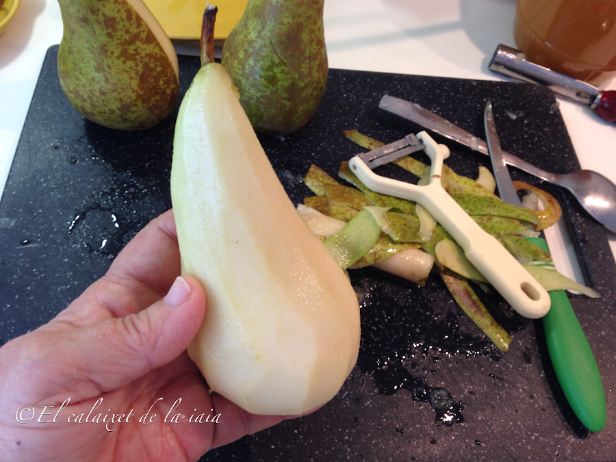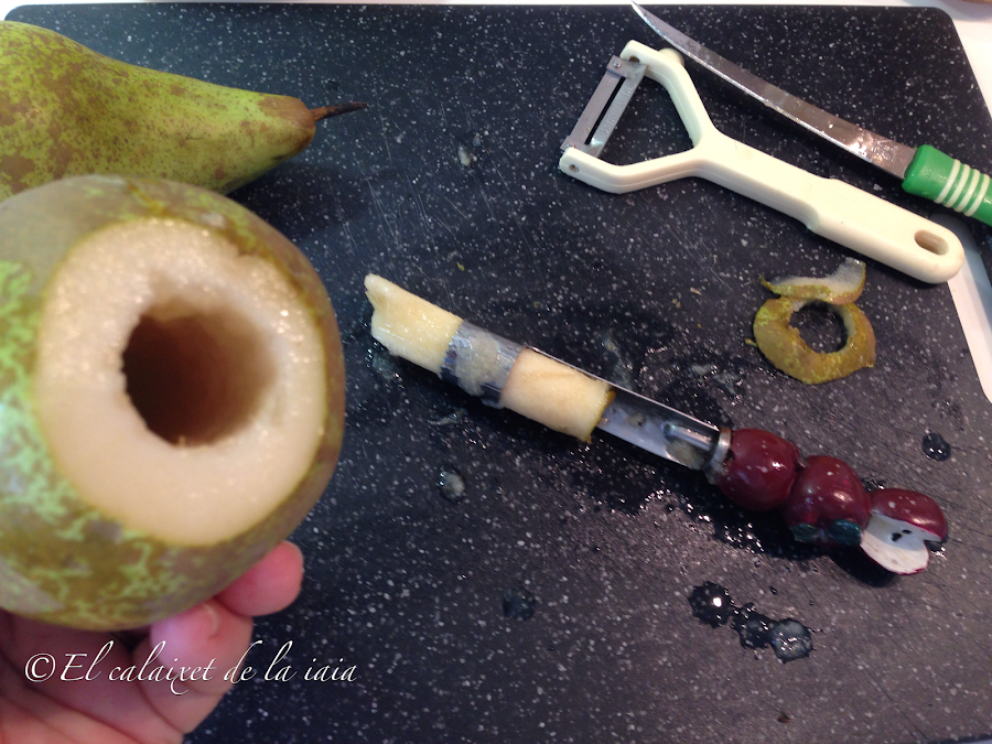 Mientras tanto, descorazonamos las peras. Éste paso no es imprescindible, pero a mi me gusta hacerlo siempre porque luego se come todo "a mòs redó"