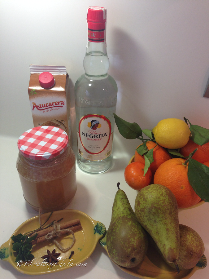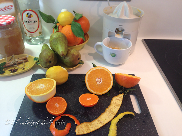 Comenzaremos lavando una pieza de cada cítrico y recortando unos trozos de piel de cada uno, procurando cojer el mínimo de blanco, porque amarga. Haremos el zumo de tres naranjas, grandes, tres mandarinas Clemenvilla y medio limón