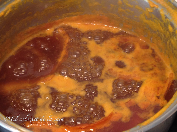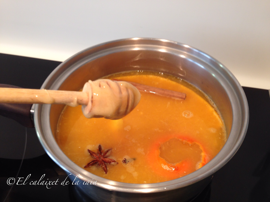 una cucharada sopera colmada de azúcar moreno y una cucharada de miel de romero. En casa no nos gustan los dulces empalagosos, os aconsejo probarlo por si decidís añadir mas azúcar o miel.Ponemos a calentar a fuego medio