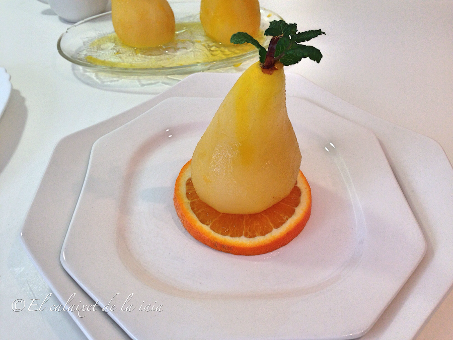 Colocaremos la rodaja de naranja en el plato de postre, y sobre la misma, la pera, decoraremos con hierbabuena alrededor del rabito